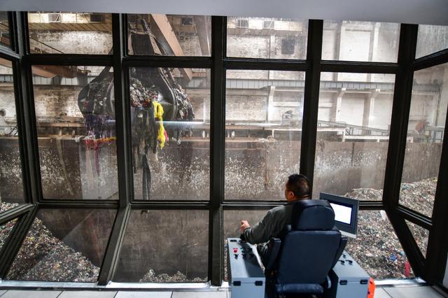 9月19日,在山東啟迪濟(jì)能環(huán)??萍加邢薰荆ぷ魅藛T在控制室內(nèi)操作設(shè)備吊運(yùn)垃圾。