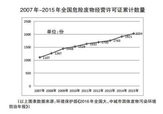 環(huán)境保護部近日公布的《2016年全國大、中城市固體廢物污染環(huán)境防治年報》(以下簡稱《2016年報》)顯示,全國危險廢物處理能力明顯提高,截至2015年底,各省(區(qū)、市)累計頒發(fā)的危險廢物(含醫(yī)療廢物)經(jīng)營許可證共2034份,比2014年增加113份,全國危險廢物經(jīng)營單位核準(zhǔn)危廢處理能力達5263萬噸/年,較同期提高959萬噸/年。