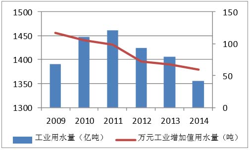 工業(yè)部門是用水大戶。2014年,工業(yè)總用水量1356.1億噸,、占全國年用水總量的22.2%。萬元工業(yè)增加值用水量從2007年的126噸下降至2014年的59.5噸。受用水量減少影響,工業(yè)廢水處理量和處理費(fèi)用較2011年的峰值略有回落。2014年,共處理工業(yè)廢水500億噸。