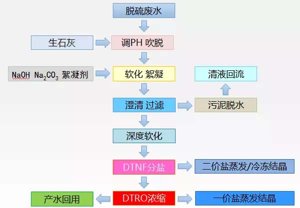 第一種是DTRO膜濃縮+蒸發(fā)結晶法,該方法可以回收水資源和結晶鹽,完全符合政府要求廢水“零排放”要求。DTRO膜系統(tǒng)對廢水的高倍濃縮大大降低了零排放成本。此外,為了確保蒸發(fā)結晶器正常運行和保證結晶鹽品質,需要對脫硫廢水進行嚴格的預處理,如去除廢水中的硬度、有機物和重金屬等。因此,要實現(xiàn)蒸發(fā)結晶法的大規(guī)模應用,必須注重強開發(fā)廢水減量化預處理技術的研發(fā),以期降低蒸發(fā)工段的建設和和運行成本,同時還要研究高效的脫硫廢水預處理技術。
