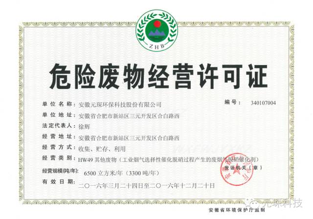 危廢轉(zhuǎn)運:安徽元琛環(huán)保是全國首家同時具有脫硝催化劑生產(chǎn)、再生及回收資質(zhì)的綜合性環(huán)保企業(yè),具有HW49廢煙氣脫硝催化劑 (《國家危廢名錄》2008版), HW50廢煙氣脫硝催化劑 (《國家危險廢物名錄》2016版)危廢經(jīng)營許可證。