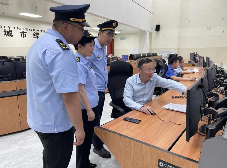 圖為雙碳數(shù)字化平臺工程師為執(zhí)法人員講解指揮中心的各項(xiàng)功能。 胡義 攝