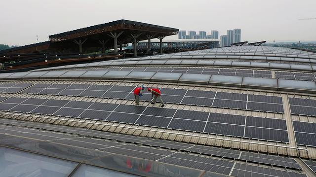 國網(wǎng)湖北電力員工檢查宜都市會展中心光伏設(shè)備運行情況。