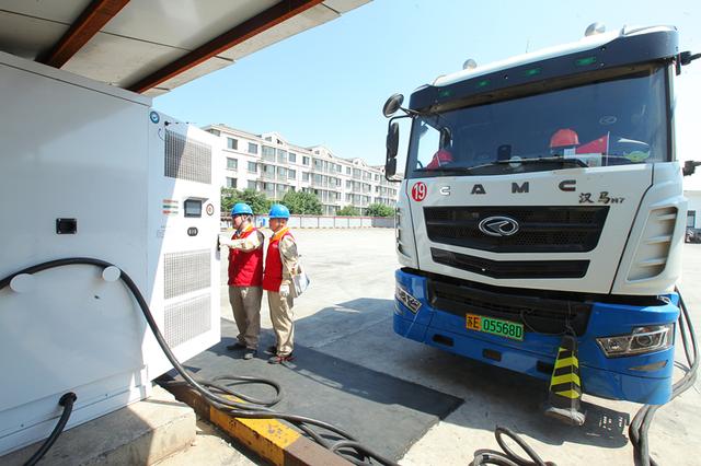 國網(wǎng)江蘇電力員工為江蘇永鋼集團有限公司電動重卡檢查充電樁。