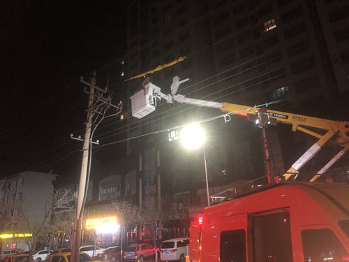 在應(yīng)急搶修燈的照明下,絕緣斗臂車絕緣臂緩緩升起,作業(yè)人員緩緩向作業(yè)點靠近,由于是夜間帶電搶修,作業(yè)能見度等條件較為不足,工作負責人不敢有一絲大意,嚴密監(jiān)護作業(yè)人員的行為。兩名帶電作業(yè)操作人員站在10多米高空的作業(yè)斗內(nèi),小心翼翼的包絕緣毯,套絕緣管,更換燒壞的熔斷器……一道道作業(yè)流程嚴謹有序,經(jīng)過3個半小時的連續(xù)搶修,故障搶修順利結(jié)束,受損線路恢復供電。
