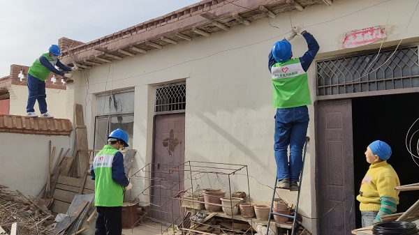 志愿者首先對(duì)老人家中用電設(shè)備和線路進(jìn)行了檢查,通過(guò)檢查發(fā)現(xiàn)接戶線老化嚴(yán)重,部分絕緣層已經(jīng)破損,存在一定安全隱患。發(fā)現(xiàn)該情況,志愿者立即與烏力吉營(yíng)業(yè)所溝通,準(zhǔn)備工器具和導(dǎo)線為其重新更換接戶線,消除了安全隱患。隨后,志愿者來(lái)到老人家院外,幫助她撿拾樹(shù)枝,劈開(kāi)后送到院內(nèi)充當(dāng)柴禾,并幫老人對(duì)小院子進(jìn)行了打掃。最后志愿者為老人送上米面油等生活用品和真摯的祝福。