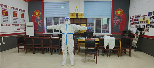 看著簡單,但是實(shí)際操作起來屬實(shí)不易。在該處團(tuán)支部(青工委)書記講解完畢后,為了讓青工能夠切身感受穿戴防護(hù)服的過程,在參會的現(xiàn)場團(tuán)員青年中挑選了一名志愿者進(jìn)行了一次模擬穿脫防護(hù)服。青工李正陽在完成一整套防護(hù)服穿戴流程后已經(jīng)是大汗淋漓,他邊擦額頭的汗水邊感慨道:“這才是穿和脫就已經(jīng)累到出汗,那些一線醫(yī)護(hù)人員一穿就是十幾二十個(gè)小時(shí),太不容易了,為他們的敬業(yè)精神感到欽佩。”