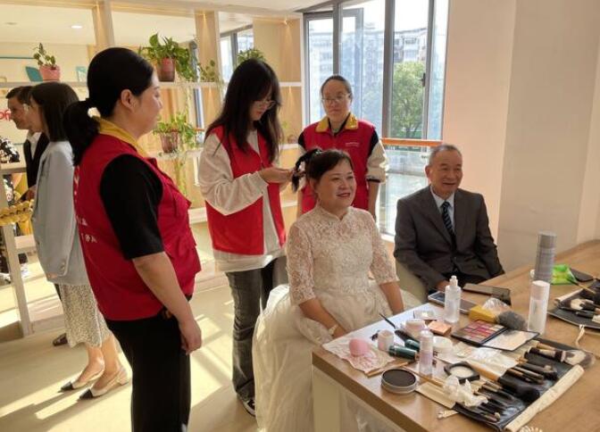 當(dāng)天,該分局青年志愿者早早來到拍攝場地布置背景墻。不一會(huì)兒,拍攝現(xiàn)場擠滿了前來照相的老人?;顒?dòng)中,一旁的志愿者還會(huì)主動(dòng)上前為老人打理發(fā)型、幫忙整理服飾。“我們結(jié)婚五十多年了,從沒拍過婚紗照,今天在家門口實(shí)現(xiàn)了婚紗夢,彌補(bǔ)了我們的遺憾,真是太感謝你們了。”年邁的劉奶奶開心地對志愿者們說道。