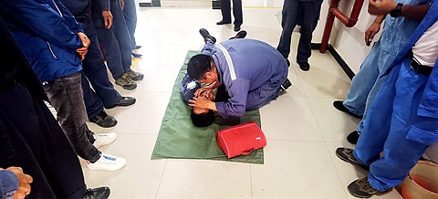 演練模擬大寺鄉(xiāng)發(fā)生6.5級(jí)破壞性地震,供電所辦公樓開(kāi)始搖晃,指揮長(zhǎng)嚴(yán)世莊大聲呼喊吹哨,各樓層內(nèi)所有人員立即采取正確的避震措施,迅速抱頭尋找最近的墻角、柱角、堅(jiān)固高大的桌下、柜旁或開(kāi)間小的衛(wèi)生間、內(nèi)承重墻墻角蹲下、抱頭、閉眼,抓牢或握實(shí)以盡量固定身體,使用安全帽等保護(hù)頭部,降低身體重心。隨著指揮長(zhǎng)第二次呼喊緊急撤離,各樓層緊急組織人員安全迅速?gòu)陌踩付ò踩ǖ朗枭⒌街付ň奂c(diǎn),過(guò)程中員工互相呼喚、提醒避震。撤離后清點(diǎn)發(fā)現(xiàn)1人失蹤,急救組立刻對(duì)失蹤人員進(jìn)行搜救,搜救人員在二樓辦公室發(fā)現(xiàn)失蹤人躺在地上,左手臂被傾倒的辦公桌壓住,造成骨折,同時(shí)發(fā)現(xiàn)兩根0.22KV電線(鋁塑線)達(dá)在傷員身上,并正通有電源,傷員無(wú)意識(shí),心跳呼吸停止同時(shí)發(fā)生人員觸電,搜救人員立即斷開(kāi)有關(guān)電源,用木棒挑開(kāi)電線,迅速轉(zhuǎn)移傷員至安全地帶后對(duì)其進(jìn)行心肺復(fù)蘇和外傷急救,并撥打120急救電話。經(jīng)全力搶救,傷員已恢復(fù)自主心跳和呼吸,搶救人員對(duì)其進(jìn)行外傷包扎后就地觀察,等待120急救人員到來(lái),同時(shí)有人員報(bào)告一樓安全工器具室發(fā)生火災(zāi),指揮組迅速組織人員對(duì)著火點(diǎn)進(jìn)行滅火器滅火。