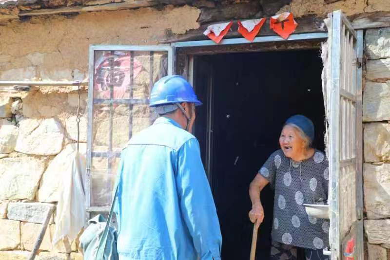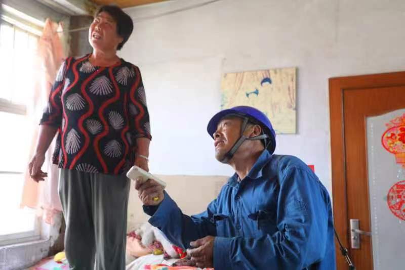土家窯自然村坐落在玖山腳下,半山腰上還有7戶老人,只有一條羊腸小道能到達(dá)。7月7日下午,山上的王繼福托人打電話,說家里沒電了,水缸也空了,沒法抽水。遲玉朋急匆匆趕了去,92歲的王繼福和老伴已經(jīng)挑不動(dòng)水了,老倆口只能靠電機(jī)抽水用。遲玉朋扛著梯子、背著工具包,從山下爬到山腰,午后天氣超乎異常的悶熱,汗水很快浸透衣服。