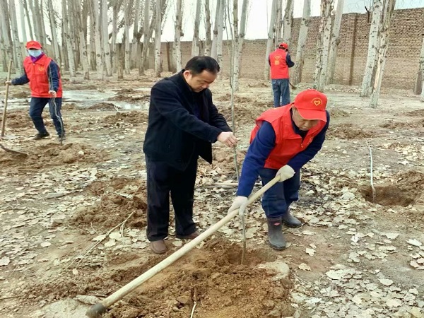 上午十點,春風送爽,天氣宜人。20余名員工按照分工要求,同志們迫不及待地拿起鐵鍬開始鏟土,認真細致地挖著樹苗和土坑,一陣緊張的忙碌過后,大家將樹苗立在土坑上面,扶好樹苗,精心的完成著從挖坑、放樹、填土、踩實到最后澆水的每一個步驟,有條不紊,很快一棵樹苗站立起來。