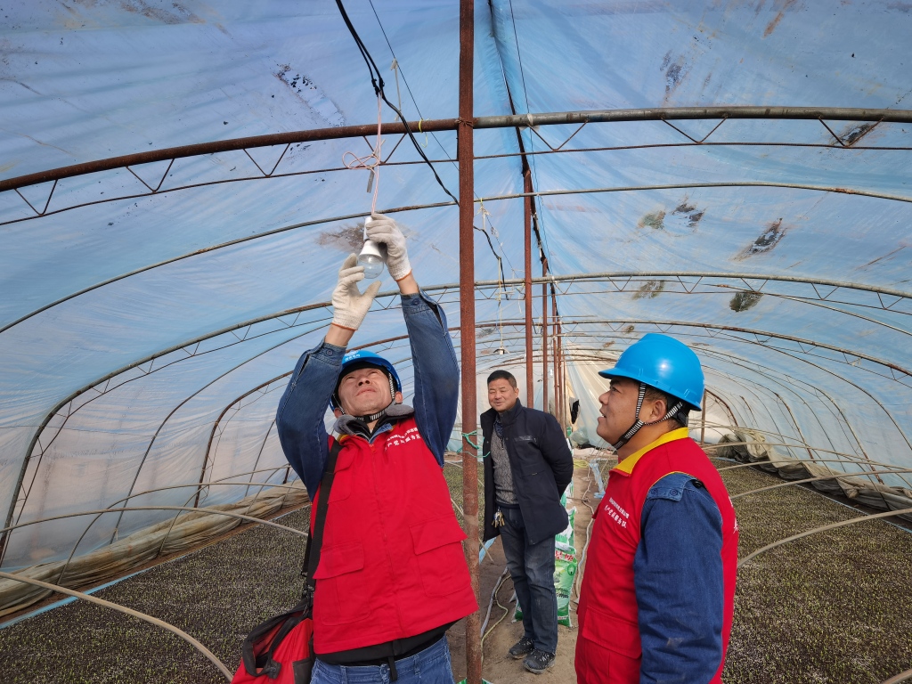國家電網(wǎng)陜西電力張思德(頻陽之光)黨員服務(wù)隊(duì)在念田村甜瓜大棚更換補(bǔ)光燈。