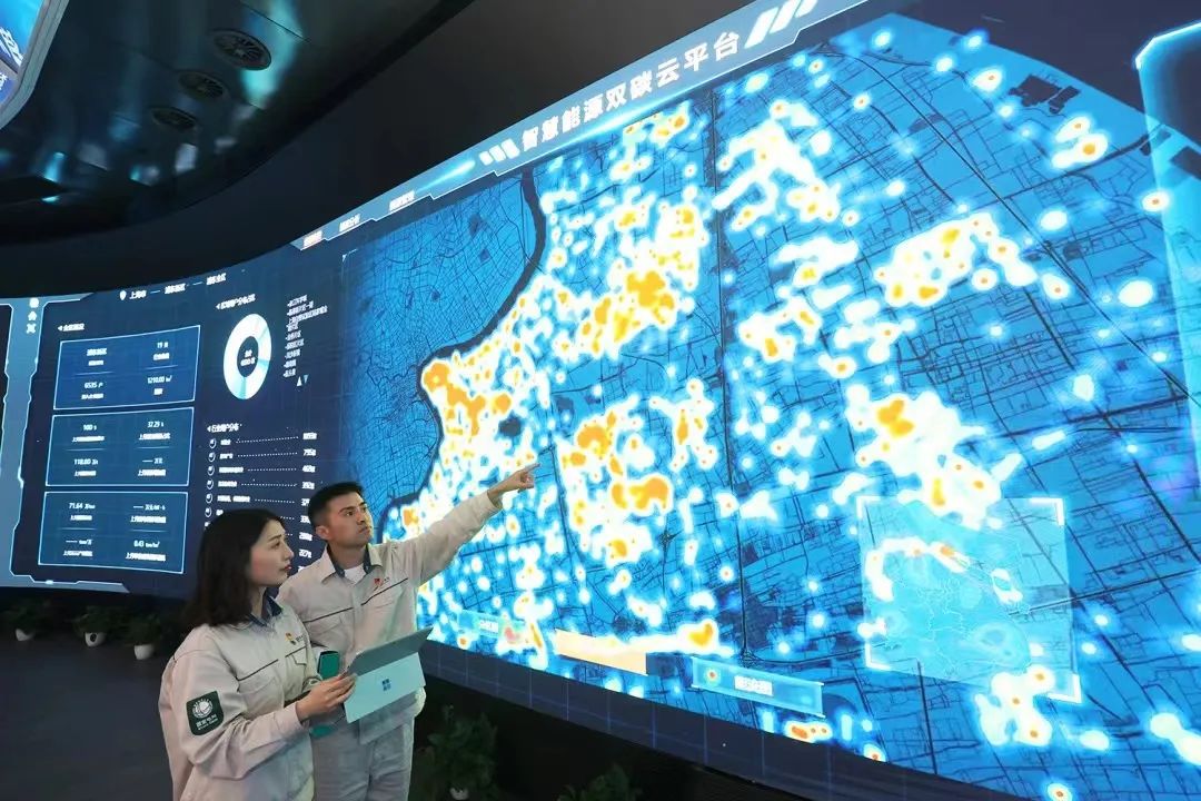 ▲國網(wǎng)上海電力員工利用智慧能源雙碳云平臺為用戶定制節(jié)能減排方案