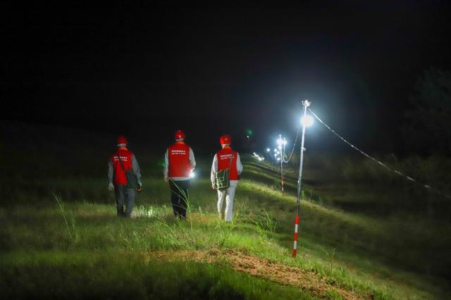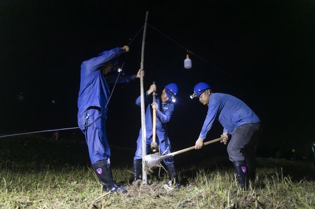 運(yùn)輸材料、組裝燈泡、打樁架線、爬桿送電……突擊隊(duì)員們克服雜草叢生、滿是泥濘的不利工作條件,于7月1日6時(shí)“點(diǎn)亮”江心鄉(xiāng)堤壩。據(jù)統(tǒng)計(jì),突擊隊(duì)員們共計(jì)安裝防雨戶外燈300余盞,敷設(shè)照明臨時(shí)線路約12千米。
