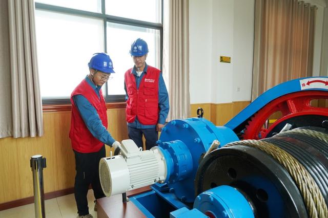 國(guó)家電網(wǎng)山東電力彩虹共產(chǎn)黨員服務(wù)隊(duì)隊(duì)員檢查許家崖水庫(kù)泄洪機(jī)組運(yùn)行情況。