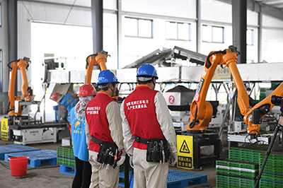 在育秧中心,一沓沓水稻秧苗托盤正在運輸軌道車上進行傳送,流水線的最后,機械臂將托盤疊放起來運至暗化區(qū)。“原來都要自己播種,然后把長好的秧苗拔出來捆成捆,運回家,現(xiàn)在方便了,機器插上電,就全幫我們做完了。”種植戶李大爺開心地說到。