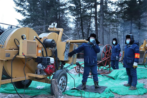 牽引機(jī)、電纜軸快速轉(zhuǎn)動,粗實的導(dǎo)線順著前方的鐵塔上的滑輪緩緩回收,導(dǎo)地線展放、張力緊線、附件安裝、導(dǎo)線壓接……冬季的寒風(fēng)刺骨,施工人員顧不上寒冷,加緊施工。