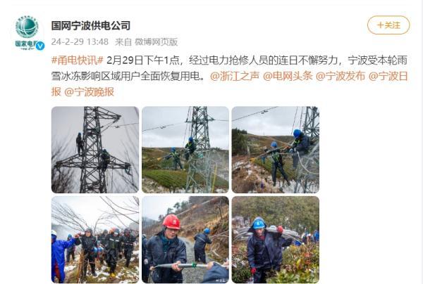 央視網(wǎng)消息:據(jù)@國網(wǎng)寧波供電公司 微博消息,2月29日下午1點,經(jīng)過電力搶修人員的連日不懈努力,寧波受本輪雨雪冰凍影響區(qū)域用戶全面恢復(fù)用電。