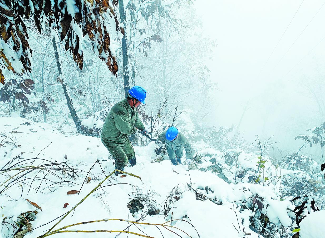 國(guó)網(wǎng)鄖西縣供電公司員工借助樹木拐杖巡視易覆冰區(qū)段線路。