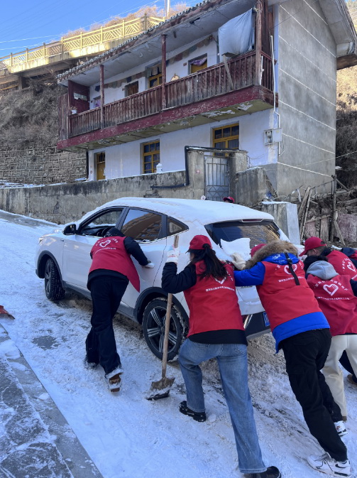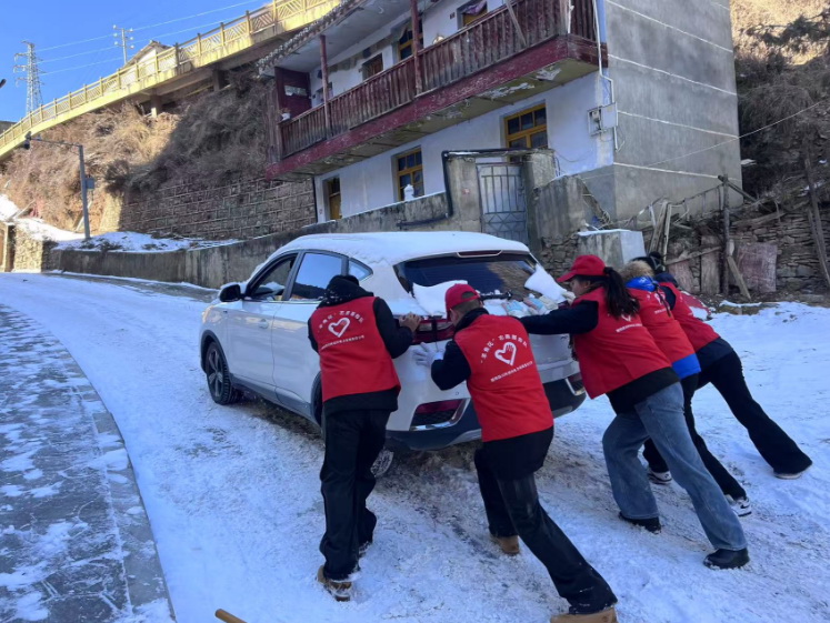 當(dāng)天早上,在德吉巷路,10余名身穿紅馬甲的“羊角花”志愿者分工協(xié)作、互相配合,有的負(fù)責(zé)鏟除厚重的積雪,有的專注清掃路面,確保不留死角。遇到結(jié)冰的地方,志愿者們更是齊心協(xié)力,用鐵鍬一點(diǎn)點(diǎn)破冰,再將碎冰和積雪清理干凈。在除雪過程中,一輛汽車爬坡行駛受路面冰雪影響,車輪不斷打滑,無法前進(jìn)。附近的志愿者們見狀,立刻放下手中工具,迅速趕來幫忙。他們分成兩組,一組在車后用力推動(dòng),一組在車前指揮方向,齊聲喊著口號(hào),齊心協(xié)力助力車主解決困難。經(jīng)過近兩小時(shí)的共同努力下,道路及兩旁的人行道清理出安全路線,方便群眾出行。