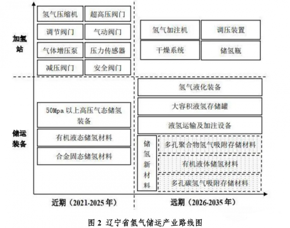 近期(2021-2025年),重點發(fā)展50兆帕以上高壓氣態(tài)儲氫裝備和低溫液態(tài)儲氫裝備,同時開展有機液態(tài)儲氫、合金固態(tài)儲氫等儲氫材料的研發(fā)和生產(chǎn)。遠期(2026-2035年),積極發(fā)展氫氣液化裝備、大容積液氫存儲罐、液氫運輸及加注設備等儲氫裝備,同時開展有機液體儲氫材料、多孔碳氫氣吸附存儲材料、多孔聚合物氫氣吸附存儲材料的研發(fā)和生產(chǎn)。