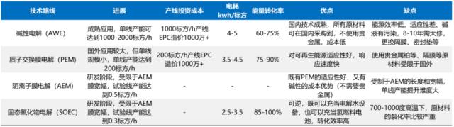 當(dāng)前,綠氫生產(chǎn)技術(shù)主要有堿性電解(ALK)、質(zhì)子交換膜電解(PEM)、陰離子交換膜電解(AEM)以及固體氧化物電解(SOEC)四種。其中堿性制氫技術(shù)成本最低,國內(nèi)90%項目采用該技術(shù),海外此前以PEM為主,近兩年為降本也逐步轉(zhuǎn)至堿性路線,預(yù)計未未來的規(guī)模化集中式電解水制氫以堿性為主。