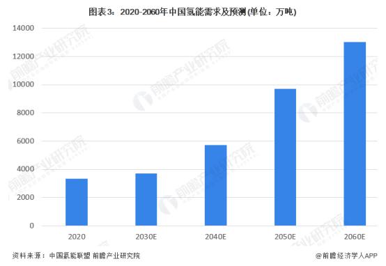 根據(jù)中國氫能聯(lián)盟的預(yù)測,2020 年以后中國氫能需求將持續(xù)增加,尤其是 2030 年以后,為達成 " 碳中和、碳達峰 " 的目標(biāo),氫能需求量將大增。到 2060 年,中國氫能年需求將超過 1.3 億噸。