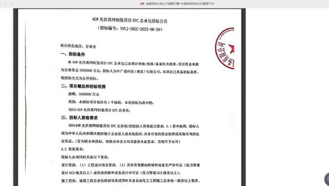 6月21日,一份甘肅4GW光伏離網(wǎng)制氫項(xiàng)目EPC總承包招標(biāo)公告,在中國(guó)招標(biāo)投標(biāo)公共服務(wù)平臺(tái)發(fā)布。文件顯示招標(biāo)主體為中廣通科技(酒泉)有限公司(以下簡(jiǎn)稱“中廣通酒泉”),該項(xiàng)目資金來源為自籌資金350億。