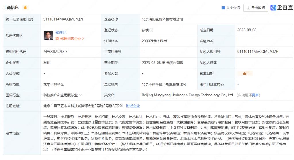據(jù)企查查顯示,8 月 8 日,北京明陽氫能科技有限公司注冊成立,該公司注冊資本 2000 萬元,由風(fēng)電龍頭企業(yè)明陽集團、祿順有限公司(LUCKY PROSPERITY COMPANY LIMITED)、北京永氫宏企業(yè)管理中心 ( 有限合伙 ) 等多家單位共同持股,其中明陽集團持有 55% 股份、為最大股東,明陽集團董事長張傳衛(wèi)擔(dān)任該公司法定代表人。