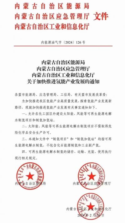 通知明確,允許在化工園區(qū)外建設(shè)太陽(yáng)能、風(fēng)能等可再生能源電解水制氫項(xiàng)目和制氫加氫站。太陽(yáng)能、風(fēng)能等可再生能源電解水制氫項(xiàng)目不需取得危險(xiǎn)化學(xué)品安全生產(chǎn)許可??稍偕茉措娊馑茪涞膬?chǔ)存、運(yùn)輸、充裝、使用執(zhí)行現(xiàn)行相關(guān)規(guī)定。