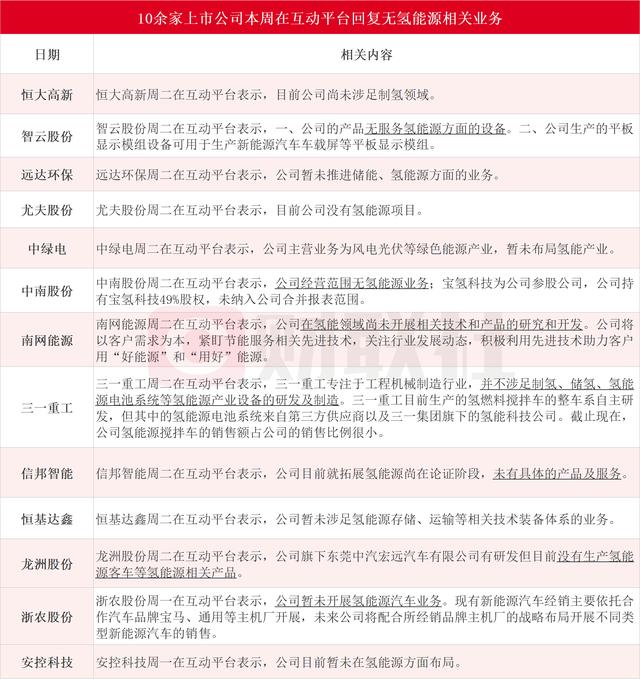據(jù)財聯(lián)社不完全統(tǒng)計,恒大高新、智云股份、遠(yuǎn)達(dá)環(huán)保、尤夫股份、中綠電、中南股份、南網(wǎng)能源、三一重工、信邦智能、恒基達(dá)鑫、龍洲股份、浙農(nóng)股份和安控科技在內(nèi)的13家上市公司本周在互動平臺無氫能源相關(guān)業(yè)務(wù)。具體情況如下圖: