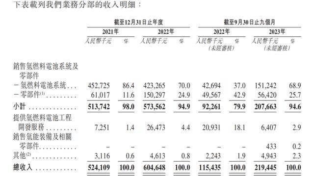目前,重塑能源主要收入來(lái)源為銷售氫燃料電池及零部件,報(bào)告期內(nèi)收入占比均超九成。