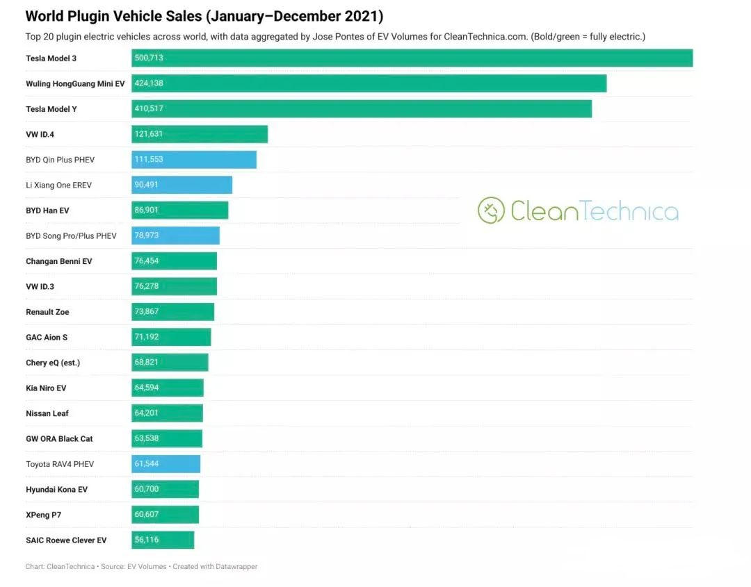 2021年全球新能源品牌銷量榜單火熱出爐。據(jù)CleanTechnica網(wǎng)站公布的2021年全球新能源品牌銷量數(shù)據(jù)顯示,2021年全球新能源車型累計(jì)銷量近650萬(wàn)輛,較去年同期增長(zhǎng)108%,其中TOP20品牌銷量476.34萬(wàn)輛,占全球銷量的73.3%。