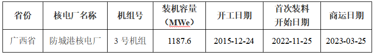 1)防城港核電廠3號機組2023年3月25日商運,機組2023年調試期間累計發(fā)電量、上網電量分別為8.02413億度、7.47180億度。