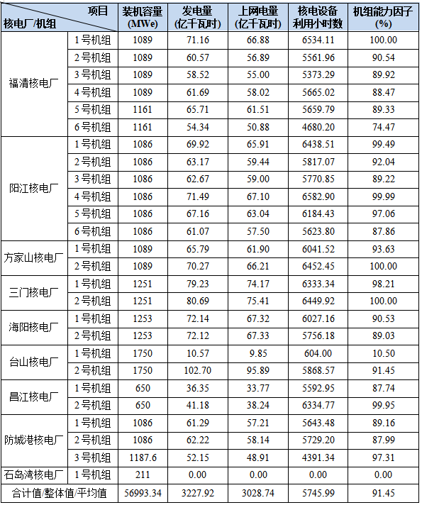 3)本表“合計值/整體值/平均值”中,裝機容量、發(fā)電量、上網電量為各機組合計值,核電設備利用小時數為全部機組整體值,機組能力因子為全部參與統(tǒng)計的機組的算數平均值。