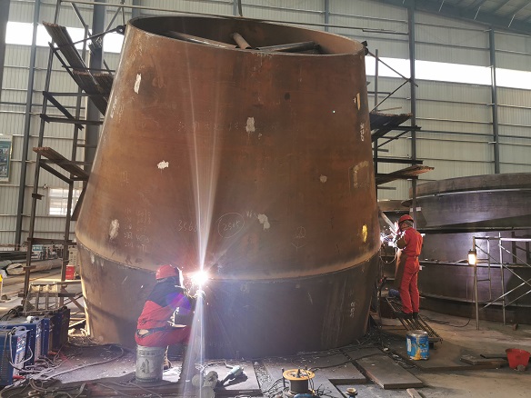 河南天池抽水蓄能電站鋼岔管為加強月牙肋型式,岔管主管直徑為4500mm,支管直徑為3100mm,分叉角為70度,擴大率為115%。制造過程中岔管管殼全部為Q690E高強度鋼,月牙肋材質(zhì)為Q690EZ35。鋼岔管體積大,悶頭焊接過程為全封閉焊接,焊接技術(shù)要求高且難度大。