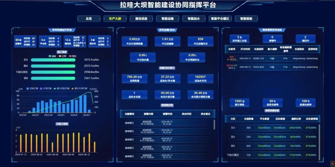 為保障世界級工程高效率高質(zhì)量建設(shè),項目團隊不斷優(yōu)化施工規(guī)劃,全面應(yīng)用無人碾壓、智能物料、智能加水、智能攤鋪等技術(shù)聯(lián)動的智慧大壩協(xié)同指揮平臺,全方位提升大壩填筑效率與質(zhì)量。截至目前,拉哇水電站大壩日填筑方量已突破3萬方,月填筑方量接近100萬方,月上升高度超過13.2米,為目前國內(nèi)上升速度最快的混凝土面板堆石壩。