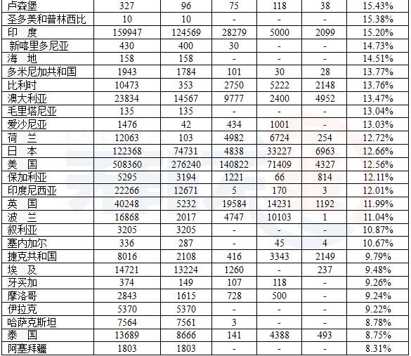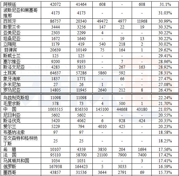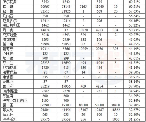 表2列出了154個國家的再生能源發(fā)電量,并有占發(fā)電總量的百分率;而且有再生能源發(fā)電總量的構成。數據取自2012~2015年各國的數據,當然數據會不斷更新,但只會更好。由于地熱發(fā)電量小,未列入表中。