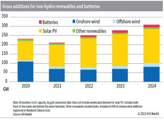 根據(jù)國(guó)際市場(chǎng)研究機(jī)構(gòu)IHS Markit的白皮書,全球每年可再生能源發(fā)電容量增量將從2020年的200吉瓦增加到2022年的約250吉瓦,然后到2024年增加到300吉瓦以上。