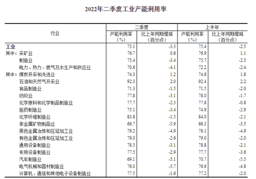 分三大門類看,二季度,采礦業(yè)產(chǎn)能利用率為76.7%,比上年同期上升0.6個百分點;制造業(yè)產(chǎn)能利用率為75.4%,下降3.4個百分點;電力、熱力、燃?xì)饧八a(chǎn)和供應(yīng)業(yè)產(chǎn)能利用率為70.6%,下降4.1個百分點。