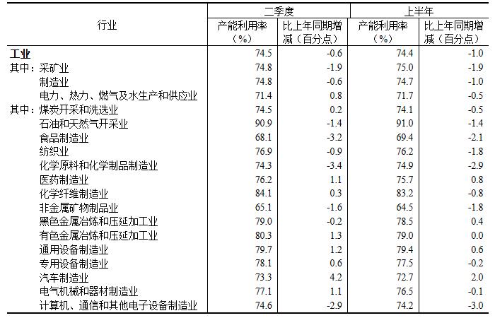 二季度,全國(guó)工業(yè)產(chǎn)能利用率為74.5%,比一季度上升0.2個(gè)百分點(diǎn)。