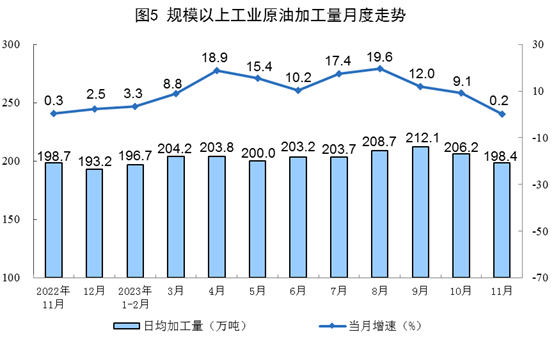 原油生產(chǎn)增速加快,進(jìn)口增速由增轉(zhuǎn)降。11月份,生產(chǎn)原油1720萬噸,同比增長2.6%,增速比10月份加快2.1個(gè)百分點(diǎn),日均產(chǎn)量57.3萬噸。進(jìn)口原油4245萬噸,同比下降9.2%,10月份為增長13.6%。
