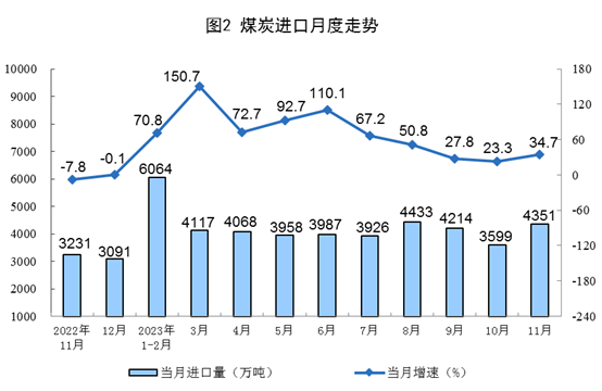 原煤生產(chǎn)有所加快,進(jìn)口較快增長。11月份,生產(chǎn)原煤4.1億噸,同比增長4.6%,增速比10月份加快0.8個(gè)百分點(diǎn),日均產(chǎn)量1379.9萬噸。進(jìn)口煤炭4351萬噸,同比增長34.7%,增速比10月份加快11.4個(gè)百分點(diǎn)。
