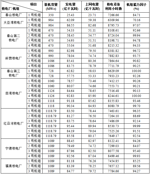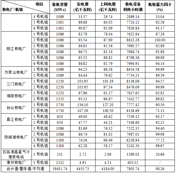3)本表“合計值/整體值/平均值”中,裝機容量、發(fā)電量、上網(wǎng)電量為各機組合計值,核電設(shè)備利用小時數(shù)為全部機組整體值,機組能力因子為全部參與統(tǒng)計機組的算數(shù)平均值。