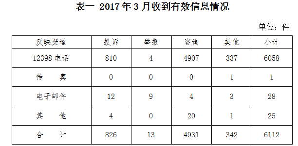 按反映渠道分類,12398電話6058件,傳真1件,電子郵件28件,其他25件。(2017年3月收到有效信息情況見(jiàn)表一)
