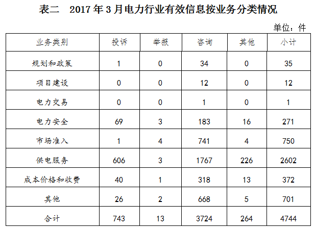 2017年3月收到的有效信息中,電力行業(yè)類4744件,占77.62%;新能源和可再生能源行業(yè)類592件,占9.69%;石油天然氣行業(yè)類80件,占1.31%;煤炭行業(yè)類6件,占0.10%;其他事項(xiàng)690件,占11.28%。