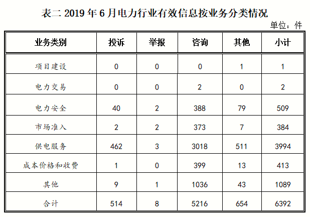電力行業(yè)排在首位,有效信息數(shù)量為6392件,占全部有效信息的80.33%;其中受理的投訴舉報數(shù)量為522件,占全部投訴舉報數(shù)量的93.38%。群眾反映的問題主要集中在供電服務(wù)、電力安全、成本價格和收費等方面。(2019年6月電力行業(yè)有效信息按業(yè)務(wù)分類情況見表二)