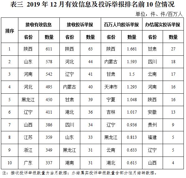 各省(自治區(qū)、直轄市)按照收到的有效信息數(shù)量排序,陜西、山東、河南、河北、黑龍江等列全國前10位;按照投訴舉報(bào)數(shù)量排序,陜西、河北、遼寧、內(nèi)蒙古、甘肅等排在全國前10位;按照百萬人均投訴舉報(bào)數(shù)量排序,陜西,內(nèi)蒙古,甘肅,天津市,寧夏等排在全國前10位;按照辦結(jié)屬實(shí)投訴舉報(bào)數(shù)量排序,甘肅、四川、云南、河南、陜西等排在全國前10位。(2019年12月有效信息及投訴舉報(bào)排名前10位情況見表三)
