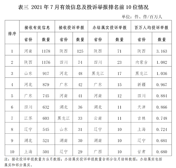 各省(自治區(qū)、直轄市)按照接收的有效信息數(shù)量排序,河南、陜西、山東、河北、廣東、四川、江蘇、遼寧、湖北、上海列全國(guó)前10位;按照接收的投訴舉報(bào)數(shù)量排序,陜西、四川、河北、廣東、河南、湖北、黑龍江、山東、湖南、遼寧排在全國(guó)前10位;按照辦結(jié)屬實(shí)的投訴舉報(bào)數(shù)量排序,陜西、四川、黑龍江、廣東、河南、湖北、云南、遼寧、湖南、廣西排在全國(guó)前10位;按照百萬(wàn)人均投訴舉報(bào)數(shù)量排序,陜西、內(nèi)蒙古、黑龍江、新疆、四川、天津、吉林、上海、遼寧、甘肅排在全國(guó)前10位。(2021年7月有效信息及投訴舉報(bào)排名前10位情況見表三)