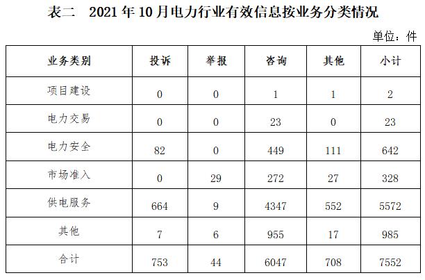 電力行業(yè)排在首位,有效信息數(shù)量為7552件,占全部有效信息的71.13%。群眾關(guān)注的內(nèi)容主要集中在故障停電、供電安全、電費(fèi)計(jì)量和收繳等方面。(2021年10月電力行業(yè)有效信息按業(yè)務(wù)分類情況見表二)